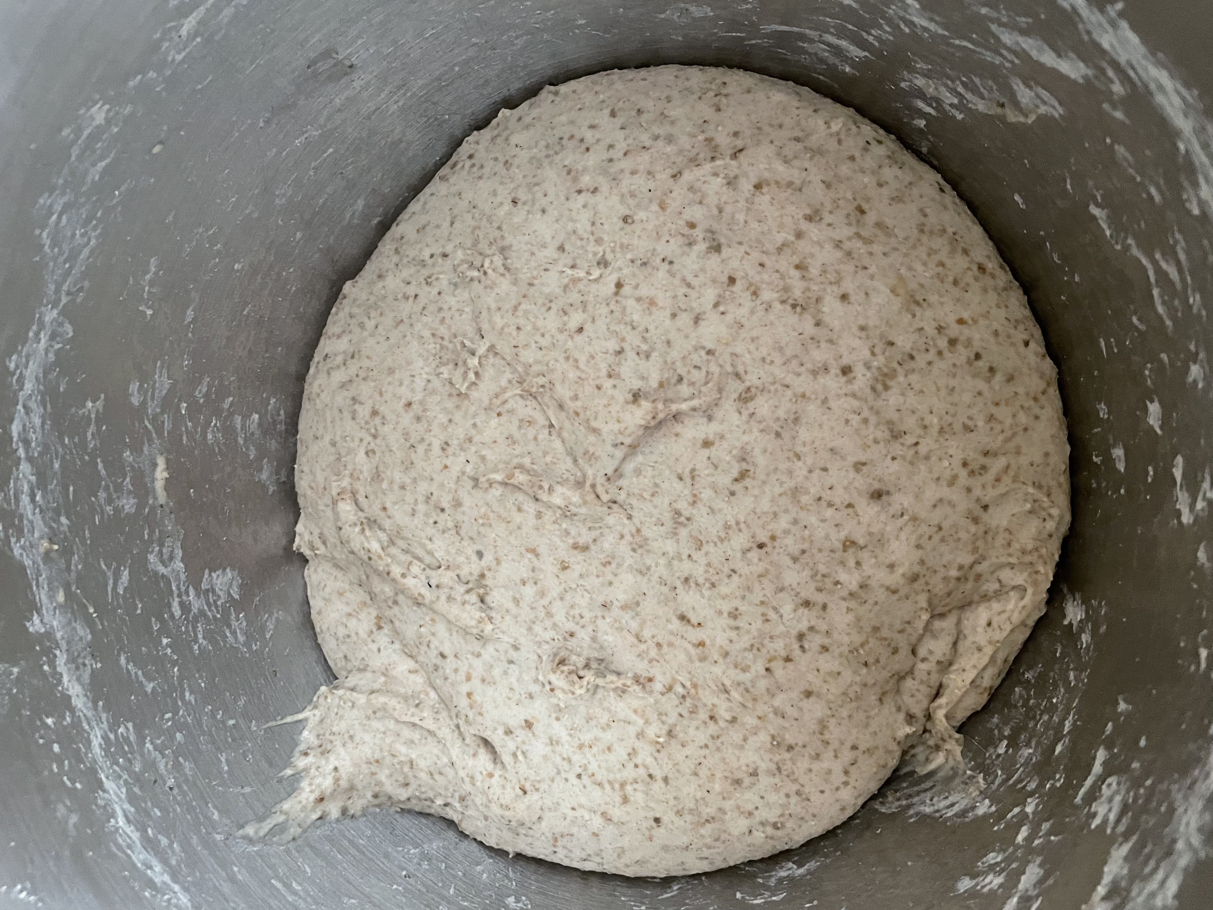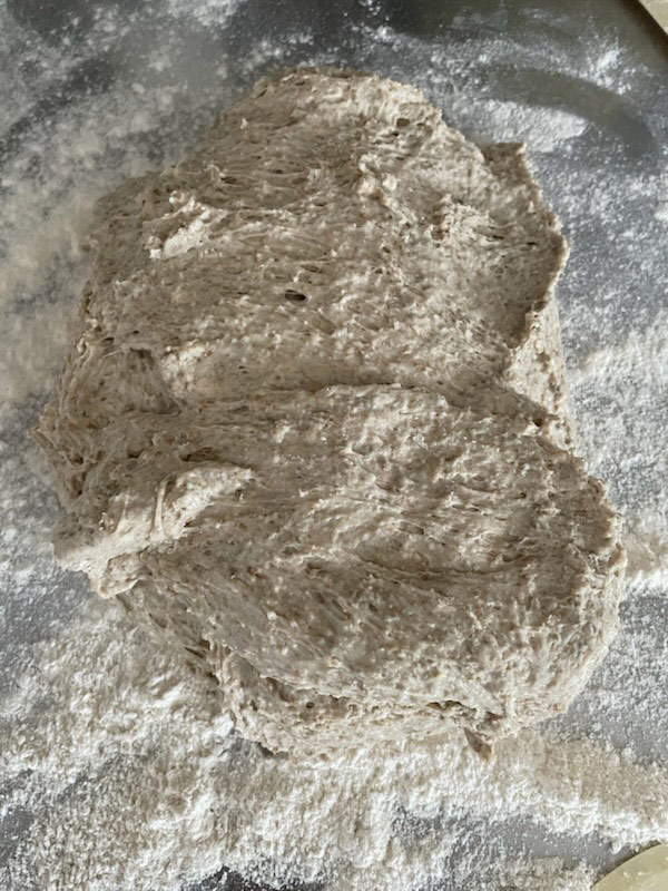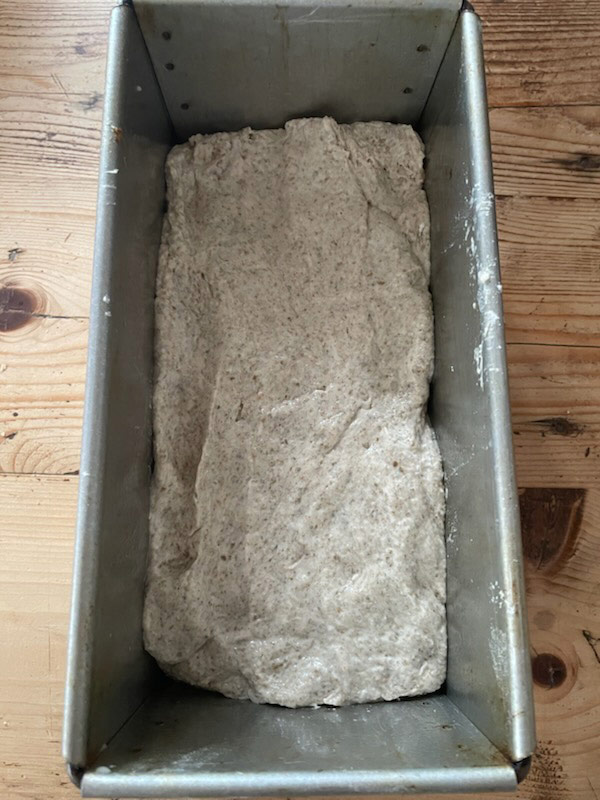 Dann den Teig mit feuchten Händen aus der Rührschüssel nehmen, in eine geölte Backform legen und gleichmäßig flach drücken. (Kann auch zu einem runden oder länglichen Laib geformt werden und im Gärkörbchen gehen.)